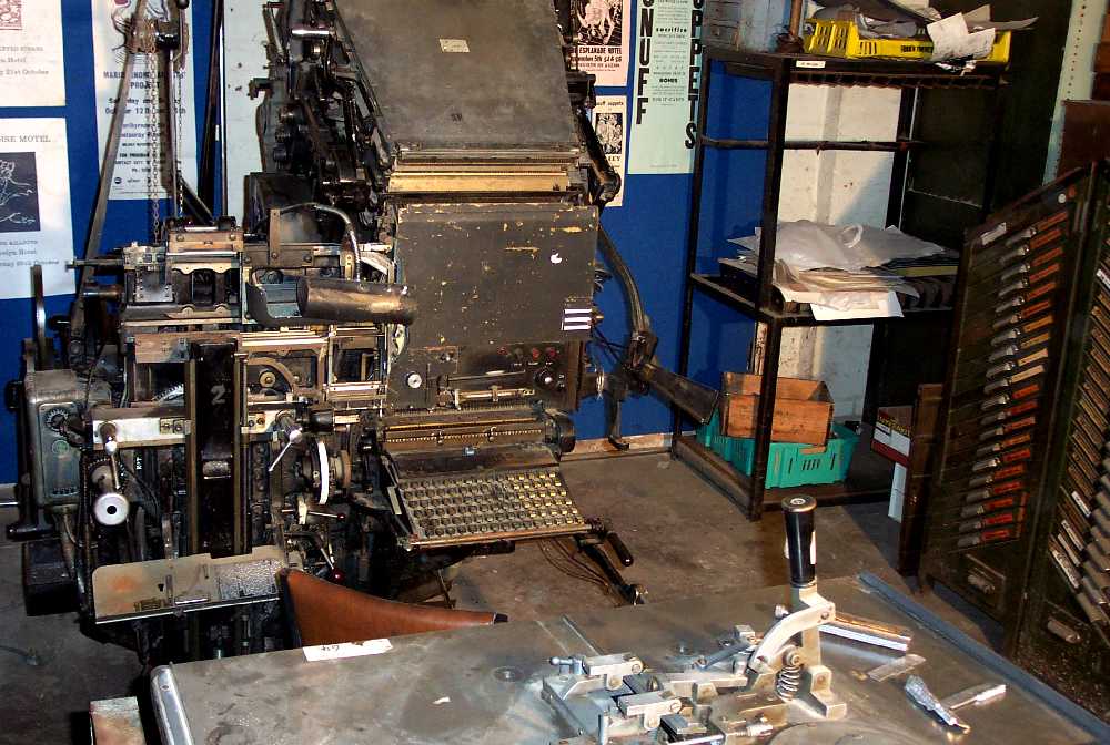The Linotype is the machine at the back of the area, with a keyboard. The Ludlow is in the foreground: we are looking at it from the back. Future Pictorials will have better shots of these wonderful machines.