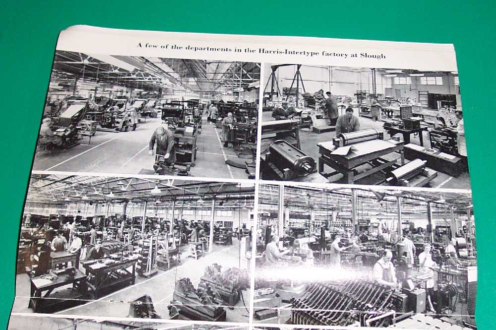 This centre-spread of photographs shows the assembly line and other features of the works of the Harris-Intertype Company, Slough, England.