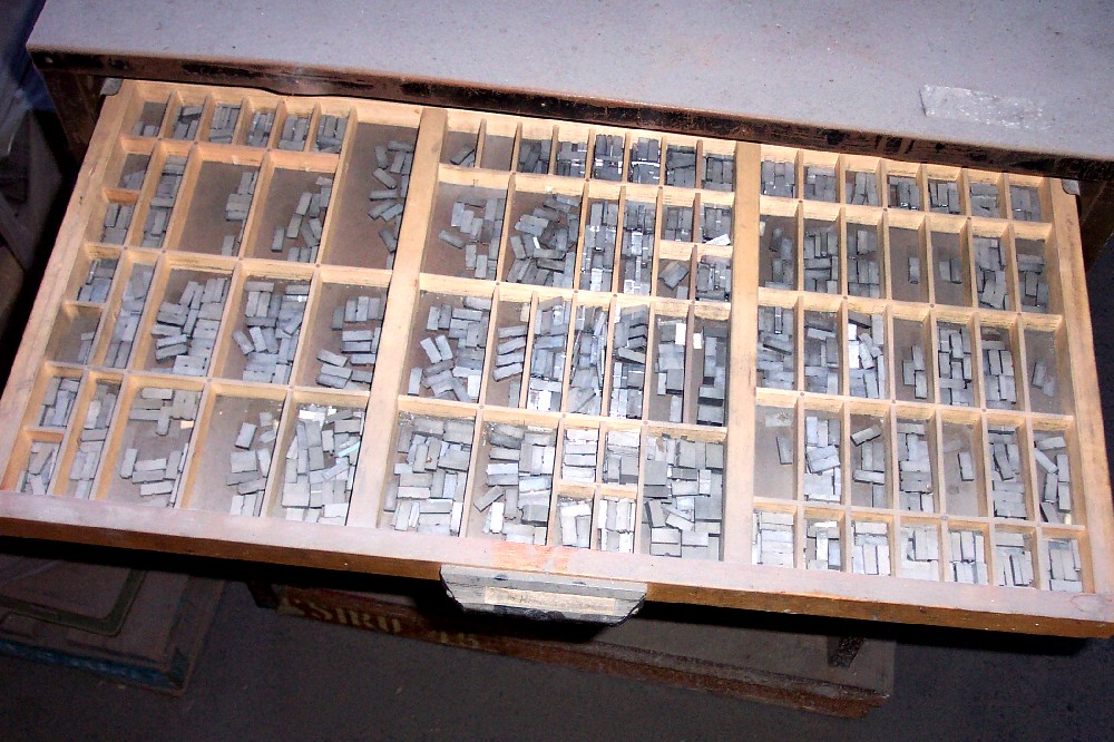The typecase is the most common storage for a fount of handset type, because it is available instantly for typesetting. Just pull the case partway out of its cabinet, or place it on top, and the full range of characters is accessible.
