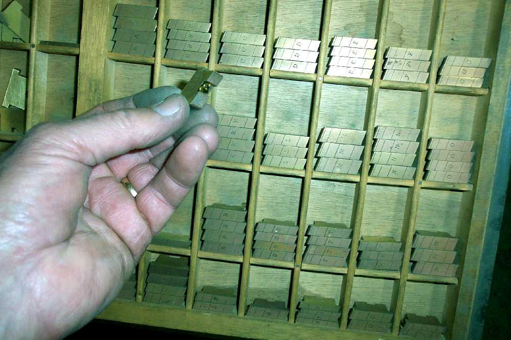 The compositor normally sees the "back" of the mats, where a legend is engraved for checking purposes. Also visible on the back of each mat is the series of horizontal lines which are unique to the particular typeface and size, so allowing any mat of the wrong fount to be spotted.