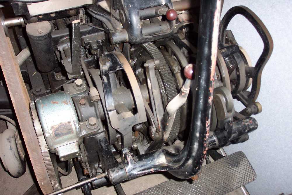 Looking down from standing on the back step, a view of the rear of a Linotype. You can see the mould cooling fan, the drive belt and driving pulley at left, then the motor, the camshaft bearing bracket, and the numerous cams (eleven in all) which drive the various motions of the machine. The camshaft driving gear (itself an inside cam) can be seen partway along the camshaft. It is driven from below by an intermediate shaft, powered in turn by an automatic clutch within the driving pulley.