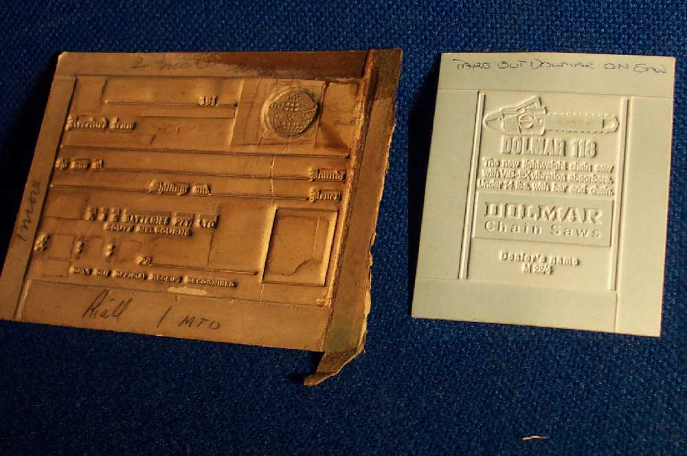 The mat on the right is an ad for a chain saw. It appears not to have been used. Advertising agencies often had multiple mats made and circulated to printers. Where the words Dealer's name appear, the plate would be cut away and the printer would insert type (handset or linotype slug) with the name of the firm selling the product locally.