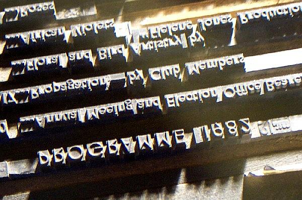 Between each line in the setting is a strip of spacing. Typically these would be leads, but most or all of those in this example are wooden strips called reglets. Reglets are lower in height than the spacing used within the line. Spaces (used mainly between words) and quads (used mainly to quickly fill longer gaps) are around 12 points below the typeface. Leads are normally around that figure, but reglets are about 20 points below. Interestingly, some lines in this shot, where the text is very short, have been finished off with a piece of reglet instead of quadding the line with quads.