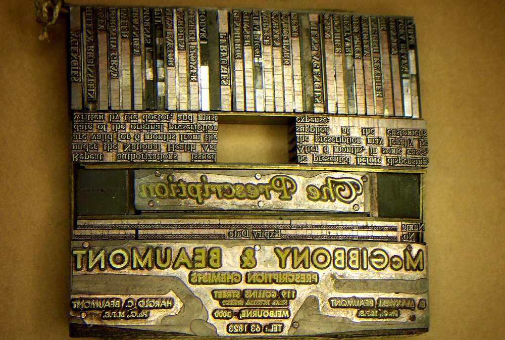 Typesettings presumably for a pharmacist's folder to be issued with dispensed medicines.