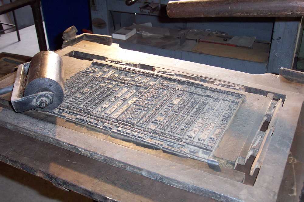 The typesetting, locked in its chase, is photographed on the bed of the Museum's Albion press, as if ready to be printed.