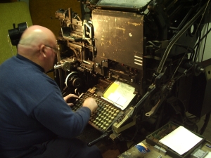 ![]() LAURIE DEMONSTRATES THE LINOTYPE WHILE MICHAEL (RIGHT) POINTS OUT THE FEATURES. | |